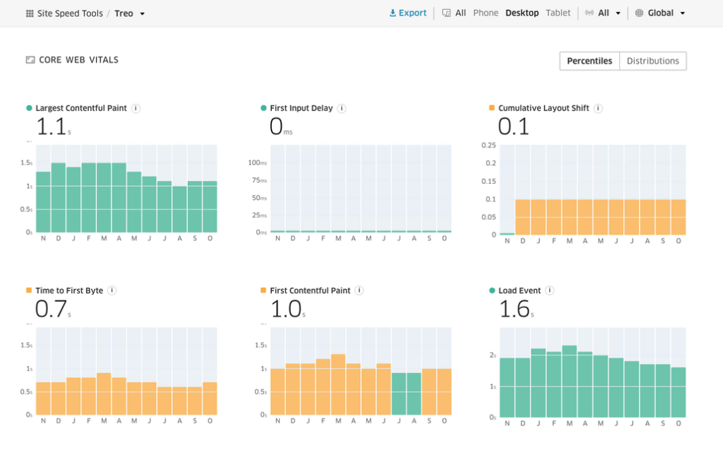 Treo offers a visualization of your Core Web Vitals real-world data(CRUx) through a UI, with access to many cool data points about your website. Core Web Vitals is now the standard of page speed.